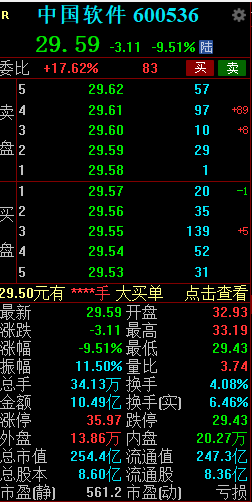 1月9日消息,中国软件午后触及跌停,截至发稿,报29.59元/股,成交10.49亿元,总市值超254亿元。