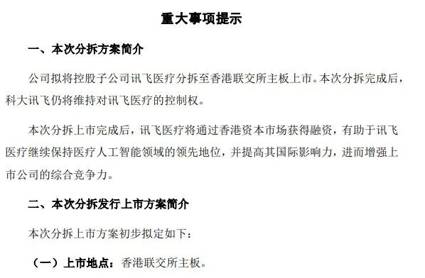 公告称,本次分拆将为讯飞医疗提供独立的上市平台,其可直接从香港资本市场获得股权或债务融资,以应对现有及未来业务扩张的资金需求,推动讯飞医疗加快产品和服务的开发迭代、灵活应对市场变化,抓住市场机遇实现业务的快速增长,深入推进其国际化战略,同时有利于上市公司充分利用资本市场,进一步提升品牌影响力,巩固行业领先地位,提升综合竞争力,对上市公司及讯飞医疗各自突出主业、增强独立性及长远发展具有重要意义。