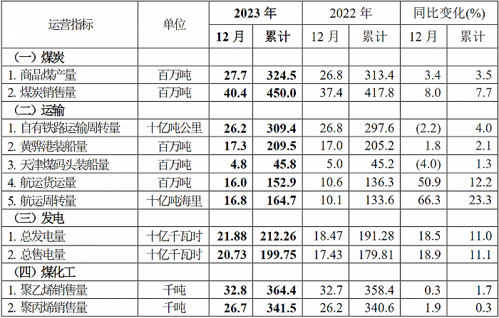 2023年1-12月,本公司航运货运量及航运周转量同比增长的主要原因是,煤炭销量增加导致航运需求增加,以及长航线业务量增加;发电量、售电量同比增长的主要原因是,全社会用电需求增长,以及新投运机组带来电量增长。