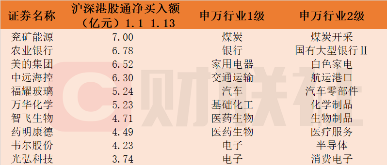 财联社1月14日讯(编辑 刘越)据Choice数据统计,1月1日至1月13日期间,北向资金累计净买入额前十位个股分别为兖矿能源、农业银行、美的集团、中远海控、福耀玻璃、万华化学、智飞生物、药明康德、韦尔股份和光弘科技,净买入额均超3亿元。北向资金本月累计净卖出额前十位个股分别为贵州茅台、隆基绿能、宁德时代、赣锋锂业、紫金矿业、分众传媒、东方财富、五粮液、中国平安和中国石油,净卖出额均超4亿元,详细情况见下表: