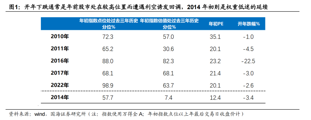 2010年以来,市场开年下跌年份有6年,分别是2010、2011、2014、2016、2017和2022。(开年下跌指市场开年前10个交易日涨跌幅为负值,下文同)市场开年下跌主要分为两种情形,一种是股市年前处在相对高位,利空事件发酵引发盘整回调如2010、2011、2016、2017和2022年。第二种情形是市场低迷又遇到偏空事件而下跌如2014年。