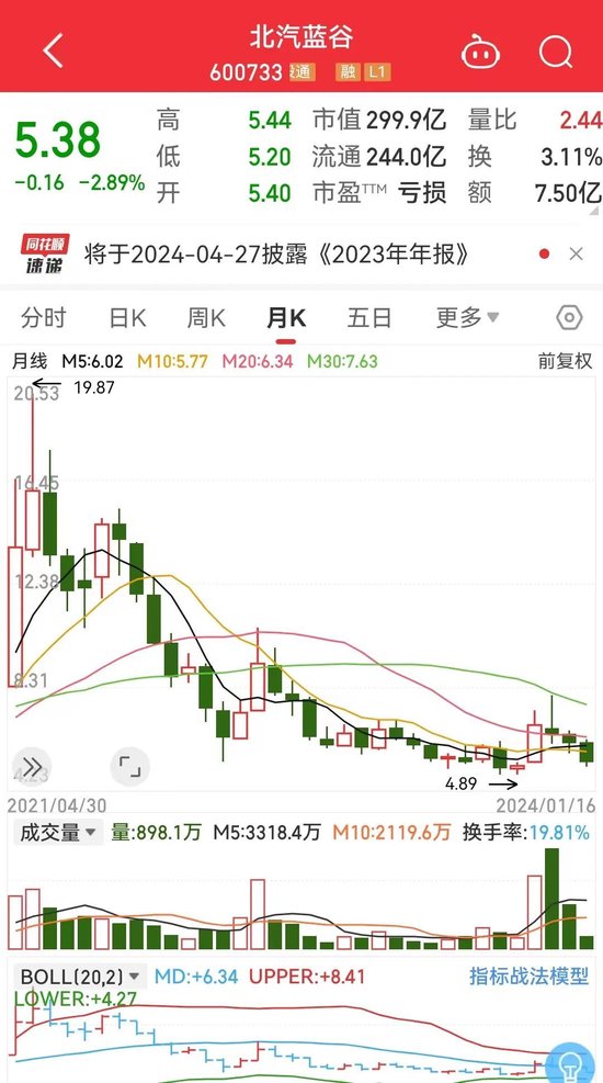 北汽蓝谷便是这个被拍在沙滩上的“前浪”。1月15日晚,北汽蓝谷发布2023年年度业绩预亏公告,预计2023年继续亏损超过50亿元。面对这样的利空消息,1月16日北汽蓝谷股票跳空低开,当日跌幅2.89%。