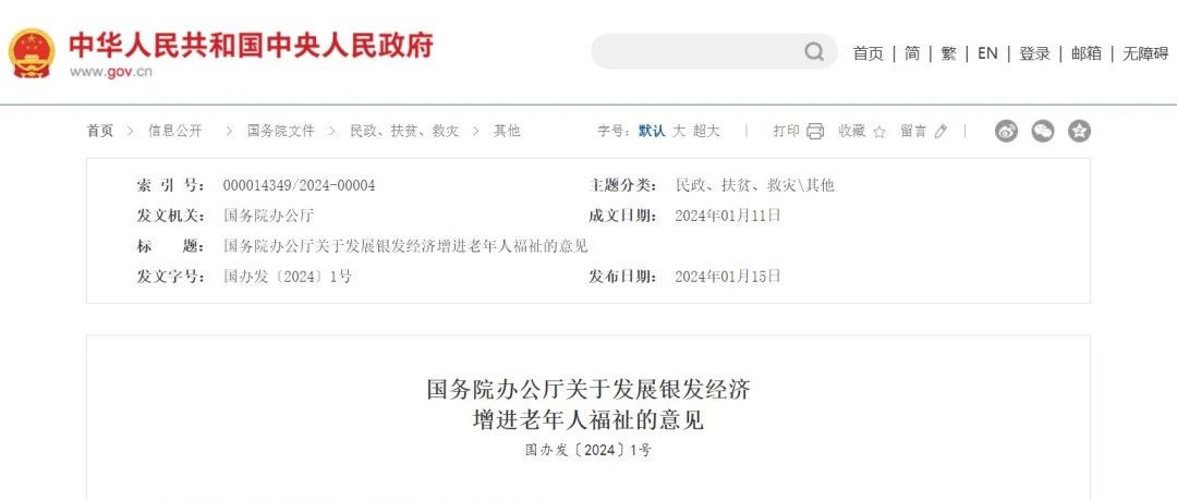 2024年1月15日,国务院办公厅发布《关于发展银发经济增进老年人福祉的意见》(下称《意见》),这是我国首部以“银发经济”命名的政策文件。