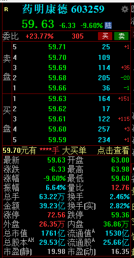 1月29日消息,A股药明康德盘中跳水逼近跌停,截止发稿,股价报59.63元,成交近40亿元。上一个交易日,1月26日午后,药明康德股价突然直线下跌,封死跌停。H股药明康德现跌3%,此前一度涨近3%。此前公司逐一回应“业内流传美提案”所涉四点:业务发展不会对任何国家的安全构成风险。