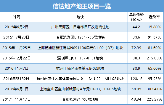据观点新媒体统计,自2015年6月夺得广州地王之后,信达地产接连在合肥、上海、深圳、杭州等地区接连抢地,三年时间共计耗资439.56亿元抢下八宗地王。