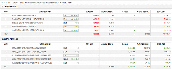光明地产1月29日涨停,全天换手率达4.59%,振幅达6.67%。龙虎榜数据显示,营业部席位合计净买入3786.02万元。其中,粤开证券苏州分公司、光大证券武汉中北路证券营业部分别买入3194.22万元、3180.46万元;华林证券深圳福华三路证券营业部、光大证券武汉关山大道证券营业部分别卖出3850.08万元、1693.42万元。