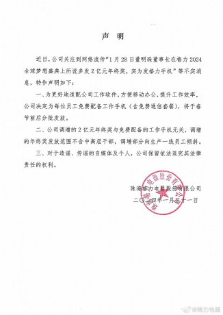 1月31日,格力电器(000651)发布声明表示,近日,公司关注到网络流传“1月28日董明珠董事长在格力2024全球梦想盛典上所说多发2亿元年终奖,实为发格力手机”等不实消息,特作声明如下: