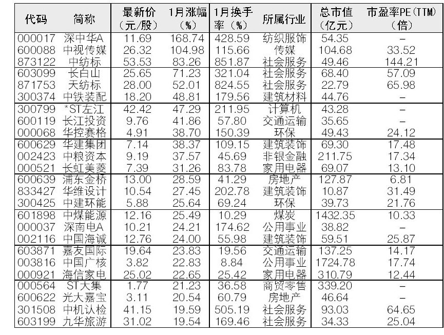 据Wind统计显示,截至1月31日,剔除1月上市新股,仅有深中华A、中视传媒两股股价1月涨幅超过100%。从行业来看,社会服务业、建筑装饰业居多。
