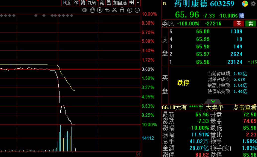 1月26日,A股药明康德午后跳水跌停,截至发稿,该股报65.96元,成交额超28亿元。