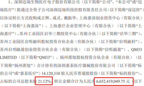 迈瑞医疗1月28日晚发布公告,公司拟通过全资子公司深迈控以协议转让方式收购成正辉、成灵、戴振华等多名转让方合计持有的惠泰医疗1412万股人民币普通股股份,占标的公司总股本的21.12%,转让金额合计为人民币66.52亿元。