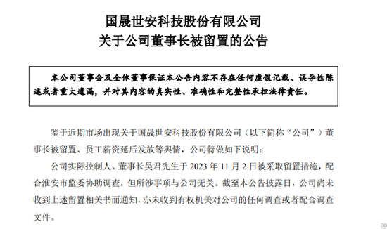 1月28日,国晟科技公告,公司实际控制人、董事长吴君于2023年11月2日被采取留置措施,配合江苏淮安市监委协助调查,但所涉事项与公司无关。