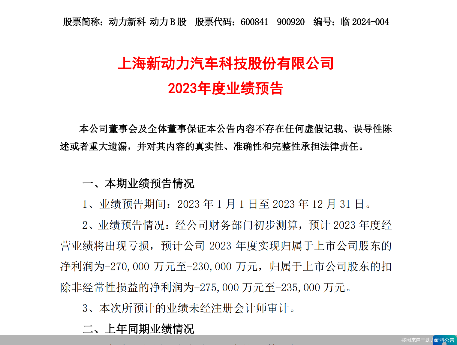 公告显示,经动力新科财务部门初步测算,预计2023年度经营业绩将出现亏损,预计公司2023年度实现归属净利润为-23亿元至-27亿元,预计扣非后净利润为-23.5亿元至-27.5亿元。