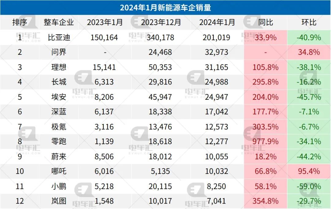 1月新能源汽车销量公布:比亚迪20.1万、问界3.3万、理想3.1万