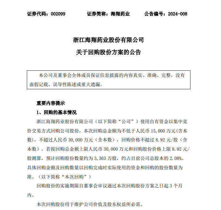 海翔药业拟1.5亿元到3亿元回购公司股份,回购价不超8.92元/股