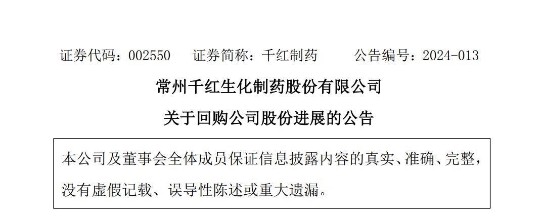 千红制药截至1月末累计回购1.81%股份,耗资约1.32亿元