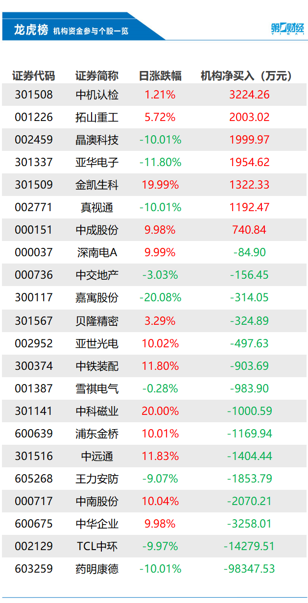 当天机构净买入前三的股票分别是中机认检、拓山重工、晶澳科技,净买入金额分别是3224万元、2003万元、2000万元。