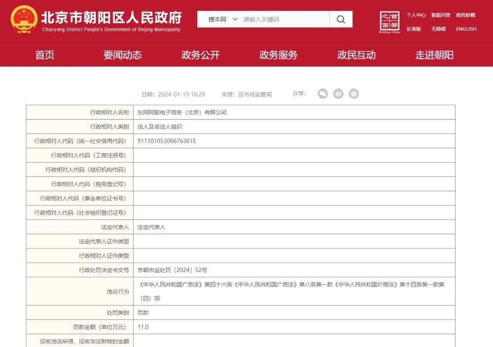 最终,朝阳区市场监管局对东阿阿胶发布违法广告和实施价格违法行为,决定合并处以警告并罚款11万元。该处罚编号为京朝市监处罚〔2024〕52号,处罚日期为2024年1月15日。