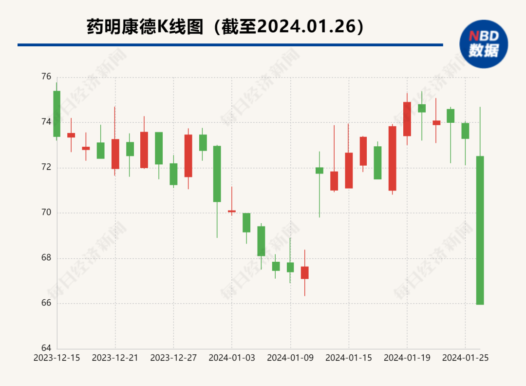 1月26日,药明系个股午后全线闪崩。A股药明康德(603259.SH)跌停,股价报收65.96元,跌幅为10%,总市值1948亿元;H股药明康德(2359.HK)盘中一度跌超20%,收跌逾16%;H股药明生物(2269.HK)收跌逾18%。