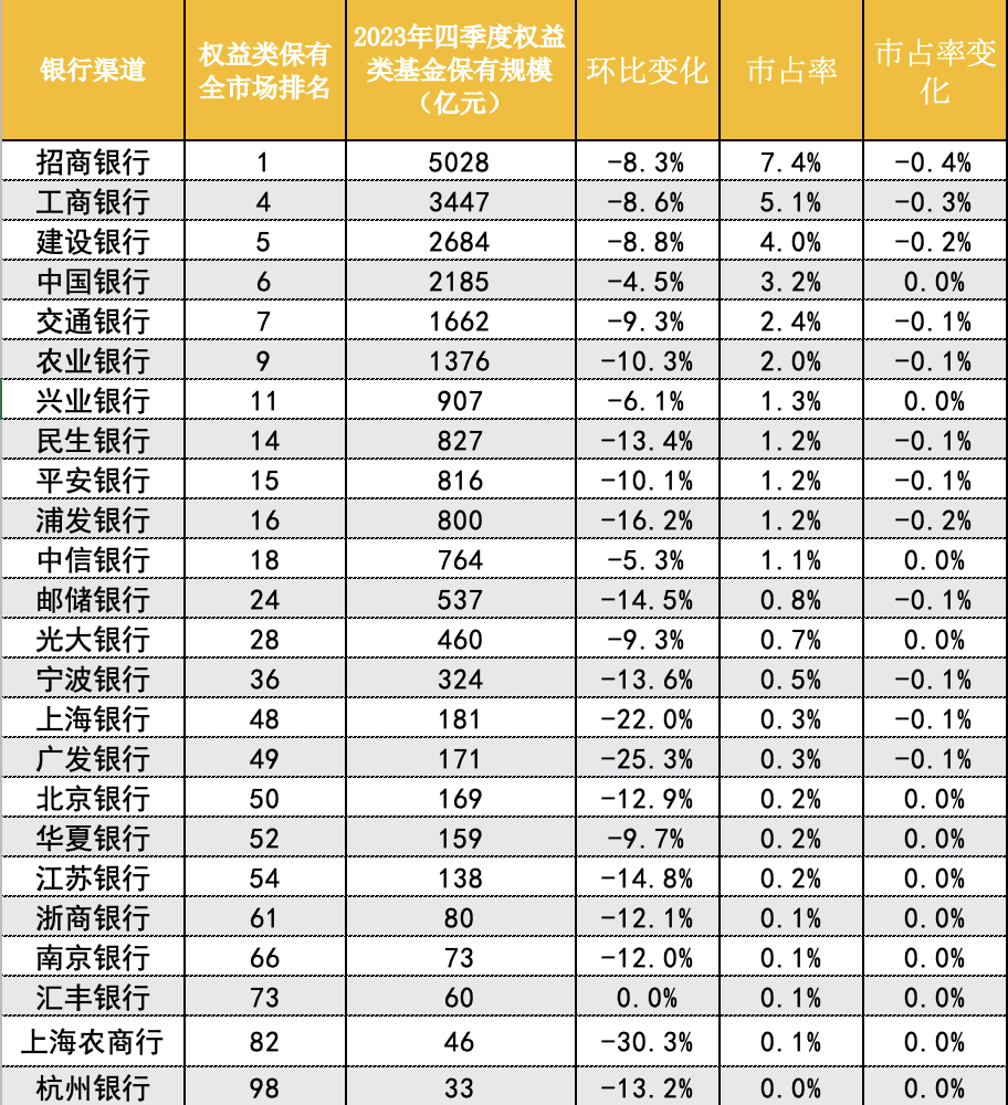 从银行渠道来看,24家银行跻身代销机构百强,数量环比持平;截至2023年四季度末,银行渠道权益类基金保有总规模为2.29万亿元,环比下滑9.3%,市占率环比下滑2.03%至33.8%。银行渠道保有规模持续下滑,四季度招商银行、工商银行、建设银行的权益类保有规模均环比下滑超过8%。