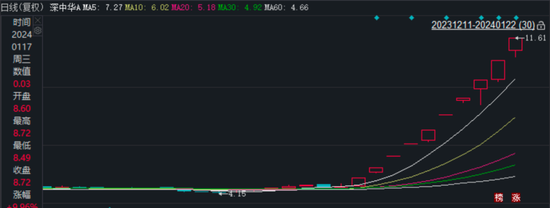 在指数节节下跌之际,深中华A股价从1月9日开始涨停,截至1月22日,公司接连报收10个涨停板,涨幅高达159.73%。