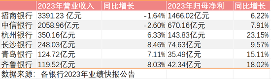 数据显示,营业收入方面,上述6家银行中,杭州银行、长沙银行、青岛银行、齐鲁银行4家银行2023年营业收入实现同比增长,招商银行、中信银行营业收入同比下降。