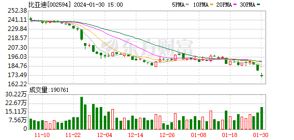 1月30日,比亚迪收盘跌3.63%,报171.97元/股。