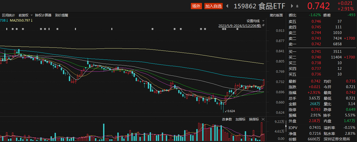 相关ETF方面,白酒行业权重超50%的食品ETF(159862)盘中持续走强,截至发稿涨近3%,50只成分股中超9成上涨,白酒股涨幅居前,其中顺鑫农业涨超6%,泸州老窖、舍得酒业涨超5%,山西汾酒、金徽酒、水井坊涨超4%,五粮液、老白干酒等跟涨。