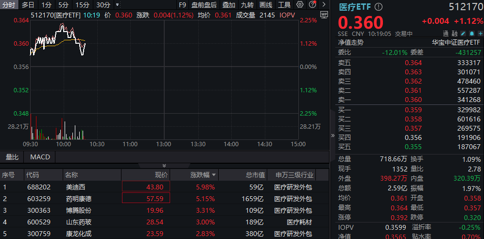 2024年3月12日早盘,医疗板块继续升温,CXO概念领涨,美迪西、药明康德涨超5%!场内热门医疗ETF(512170)盘中一度涨超2%,而后震荡回落,截至发文涨逾1%。