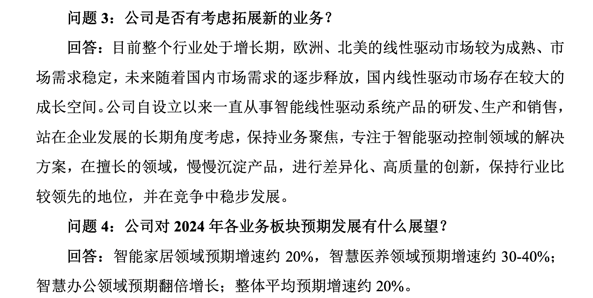 谈及对2024年公司各业务板块的展望时,豪江智能指出,智能家居领域预期增速约20%,智慧医养领域预期增速约30-40%; 智慧办公领域预期翻倍增长;整体平均预期增速约20%。