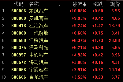 3月5日消息,汽车整车股尾盘走强,东风汽车、一汽解放直线涨停,安凯客车此前封板,江淮汽车、中通客车、长安汽车等跟涨。