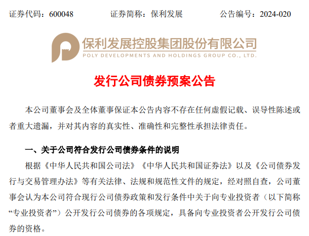 中国质量新闻网讯 3月14日,保利发展控股集团股份有限公司(以下简称“保利发展”)发布公告,拟发行规模为不超过人民币100亿元(含人民币100亿元)公司债券。