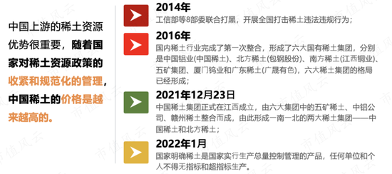 先是2016年第一次整合形成的六大国有稀土集团,2021年12月又成立了中国稀土集团,进一步整合为四大集团,分别是中国稀土集团、北方稀土、广东稀土、厦门钨业。