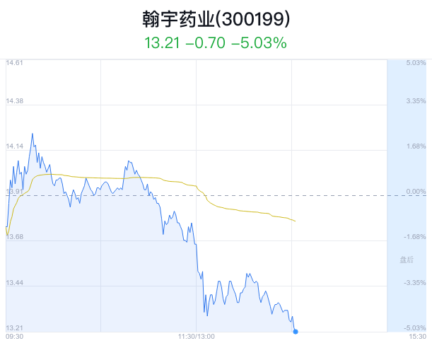 翰宇药业盘中大跌5.03% 主力净流出6519万元