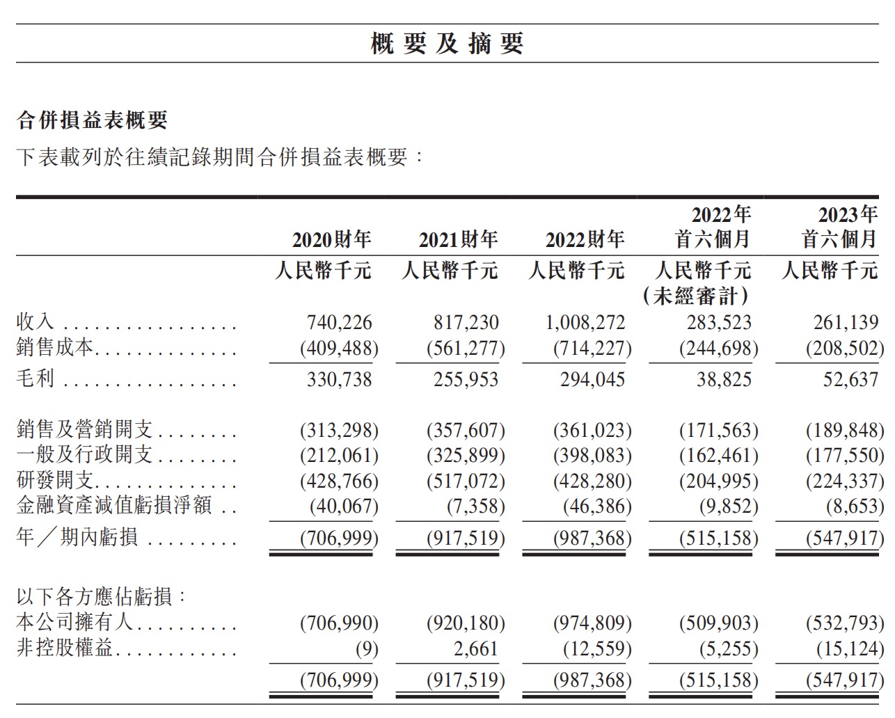 2020财年至2022财年及2023年首六个月,优必选收入分别为7.4亿元、8.17亿元、10.08亿元及2.61亿元,主要来自销售智能服务机器人及智能服务机器人解决方案;上述财报期间亏损分别为7.07亿元、9.18亿元、9.87亿元和5.48亿元。