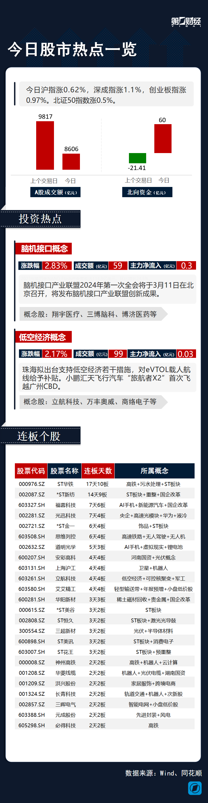 3月8日,A股三大指数集体收涨,脑机接口概念火热,低空经济概念活跃。
