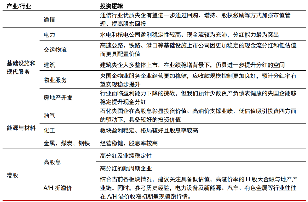 分产业与行业来看,基础设施和现代服务产业相关领域,央国企上市公司有望持续加强分红派息,将是重要催化剂。在能源与材料产业,政策有助于释放企业活力,进一步利好央国企发展及提高分红率,形成良性循环。在通信行业,优质央企集团及其下属上市公司长期增长向好,有望进一步通过回购、增持、股权激励等方式加强市值管理、提高股东回报。