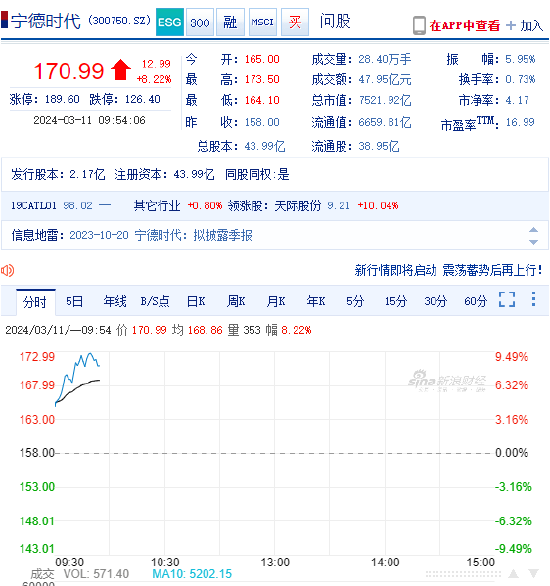 3月11日消息,宁德时代早盘一度大涨超9%,截至发稿,涨8.22%,股价报170.99元,股价创去年11月底以来新高,最新总市值约7522亿元。