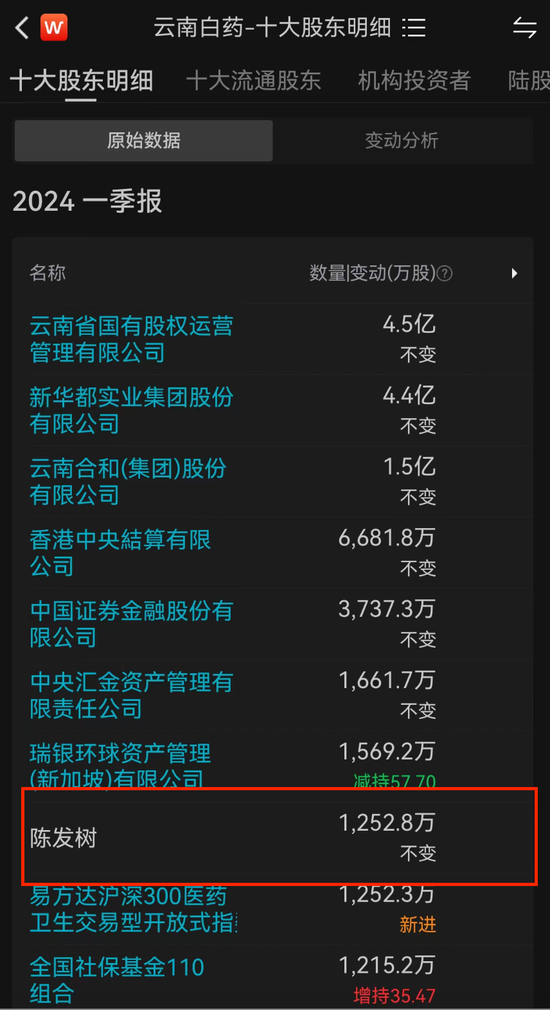 据云南白药2024年一季报,陈发树目前持有公司股票1252.8万股,系公司第八大股东。同时,他还是公司第二大股东新华都实业集团股份有限公司的实控人。据悉,陈发树是知名资本市场大佬,一度还是福建首富——2009福布斯中国富豪榜中,陈发树以218.5亿元人民币的个人财富位列11位,在福建省位列第一。