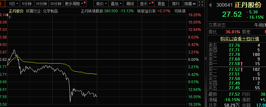 5月28日早盘,正丹股份早盘一度冲高至4%以上,临近10点53分,该股突然跳水,盘中一度跌超19%。与此同时,正丹转债价格也出现明显跳水,盘中跌幅超13%。