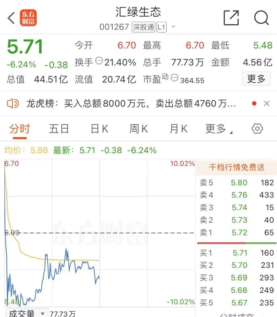5月23日,汇绿生态以涨停开盘,随后跳水,于9:34触及跌停,上演“天地板”。截至发稿,该股跌幅收窄,下跌6.24%。
