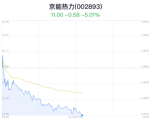 05月30日,京能热力(002893)股价大幅下跌,截至13点10分,京能热力下跌5.01%,报11.00元/股,成交1.33亿元,换手率5.87%。
