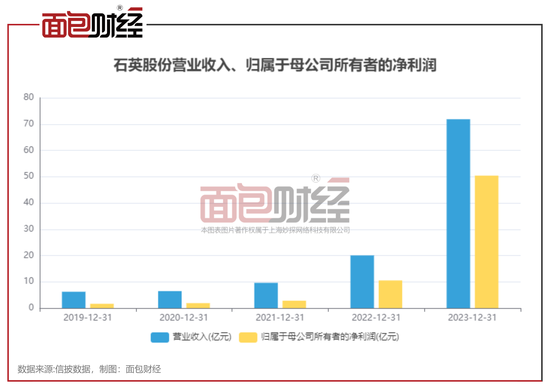 2023年,石英股份实现营收71.84亿元,同比增长258.46%;归母净利润50.39亿元,同比增长378.92%。