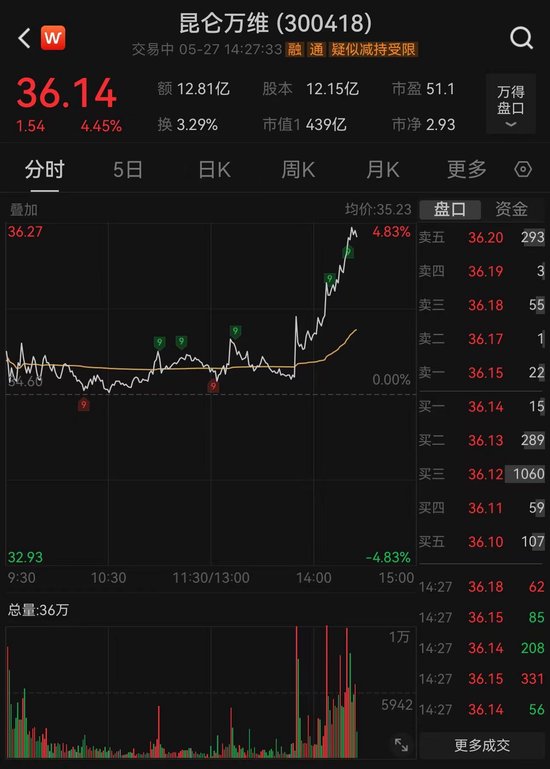Wind数据显示,截至5月27日14:27,昆仑万维股价报36.14元/股,涨4.45%。