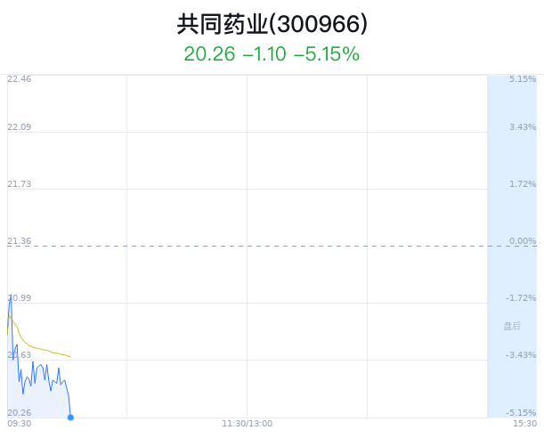 05月27日,共同药业(300966)股价大幅下跌,截至10点00分,共同药业下跌5.10%,报20.27元/股,成交8698万元,换手率5.88%,振幅5.20%。