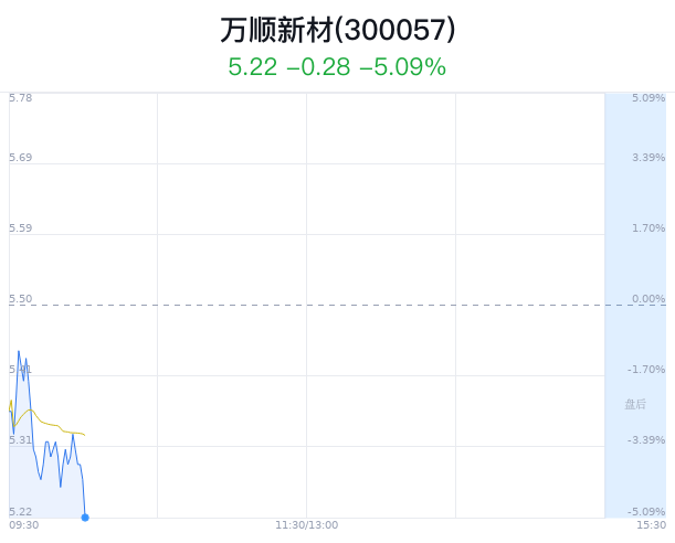 05月27日,万顺新材(300057)股价大幅下跌,截至10点00分,万顺新材下跌5.09%,报5.22元/股,成交1.18亿元,换手率3.02%,振幅4.18%。