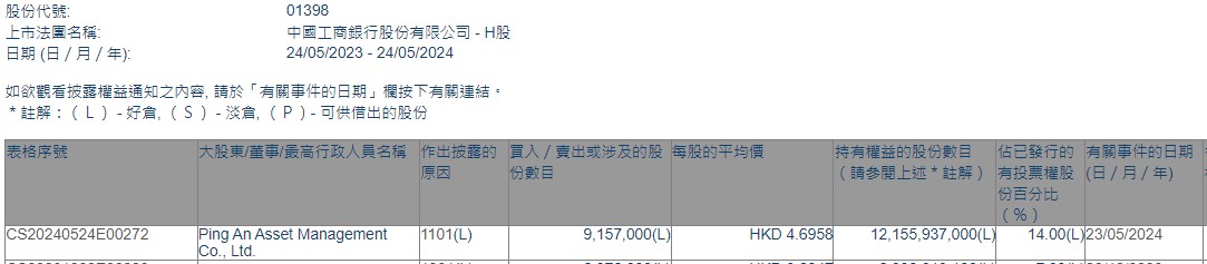 平安资产管理增持工商银行(01398)915.7万股 每股作价约4.70港元