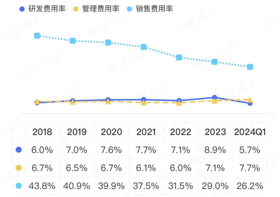 也主要是减值的影响,2019年和2021年公司的归母净利率下降至个数,分别为7.3%、9.5%,往后的年度里没有出现其他太大业绩扰动影响,叠加2022年以来公司的销售费用率下降明显,净利率随之提高到30%左右,2023年为29.6%。