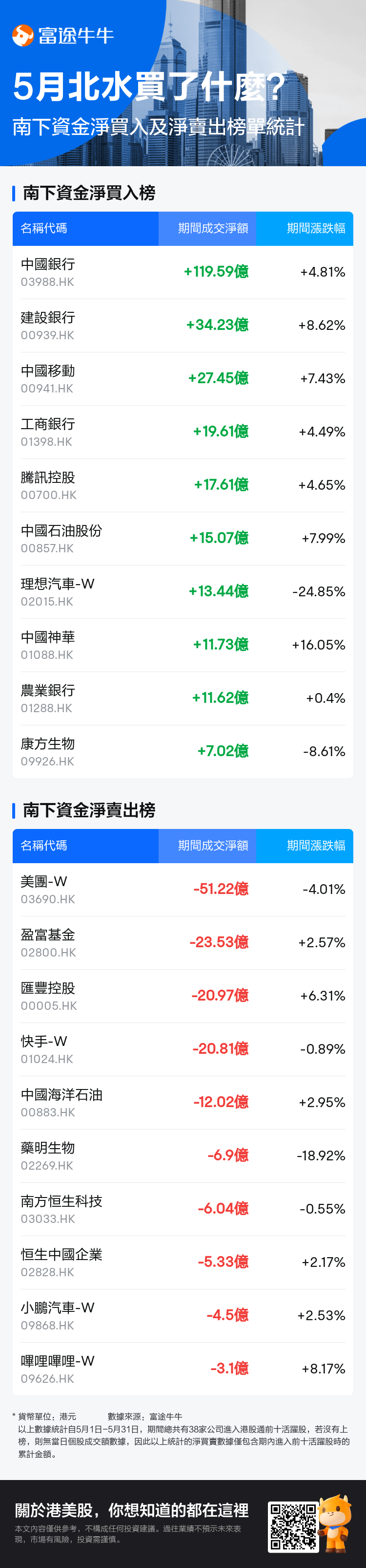数据揭秘 | 5月北水都买了什么?大幅加仓中国银行近120亿港元,抛售美团超50亿港元
