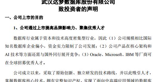 具体而言,达梦数据的上市目的有两点。一是通过上市提高品牌影响力、聚集优秀人才。二是通过上市,将公司打造成规范运作的、具有公司治理竞争力的优良企业;以高质量上市公司标准要求自身,加强投资者回报意识,与投资者共谋发展、共享成果。