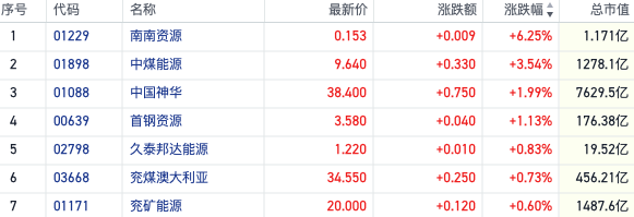 截至发稿,中煤能源(01898.HK)涨超3%刷新年内高位,中国神华(01088.HK)则涨近2%,创出历史新高。首钢资源(00639.HK)、兖矿能源(01171.HK)纷纷跟涨,距离创新高也都仅一步之遥。